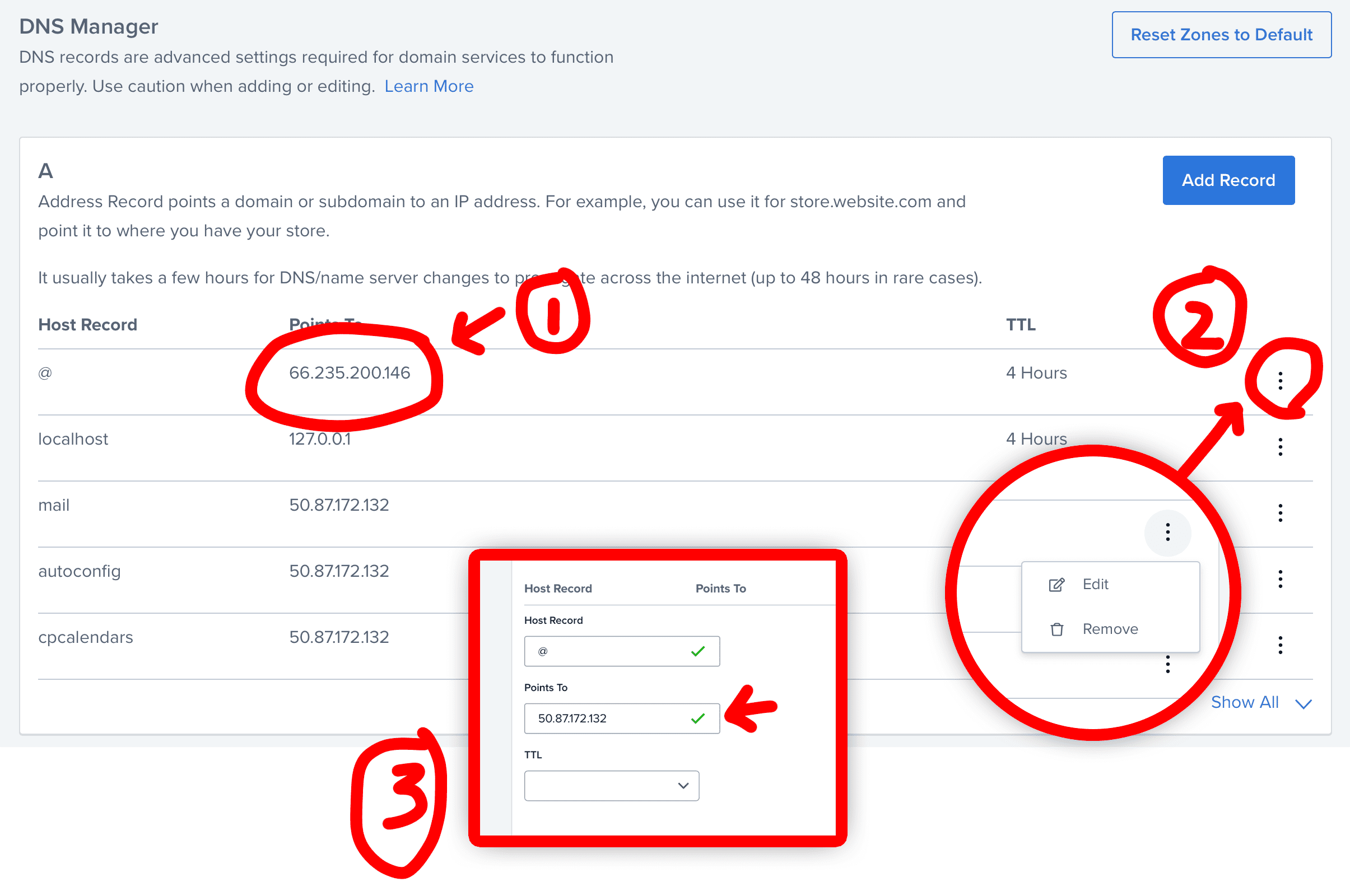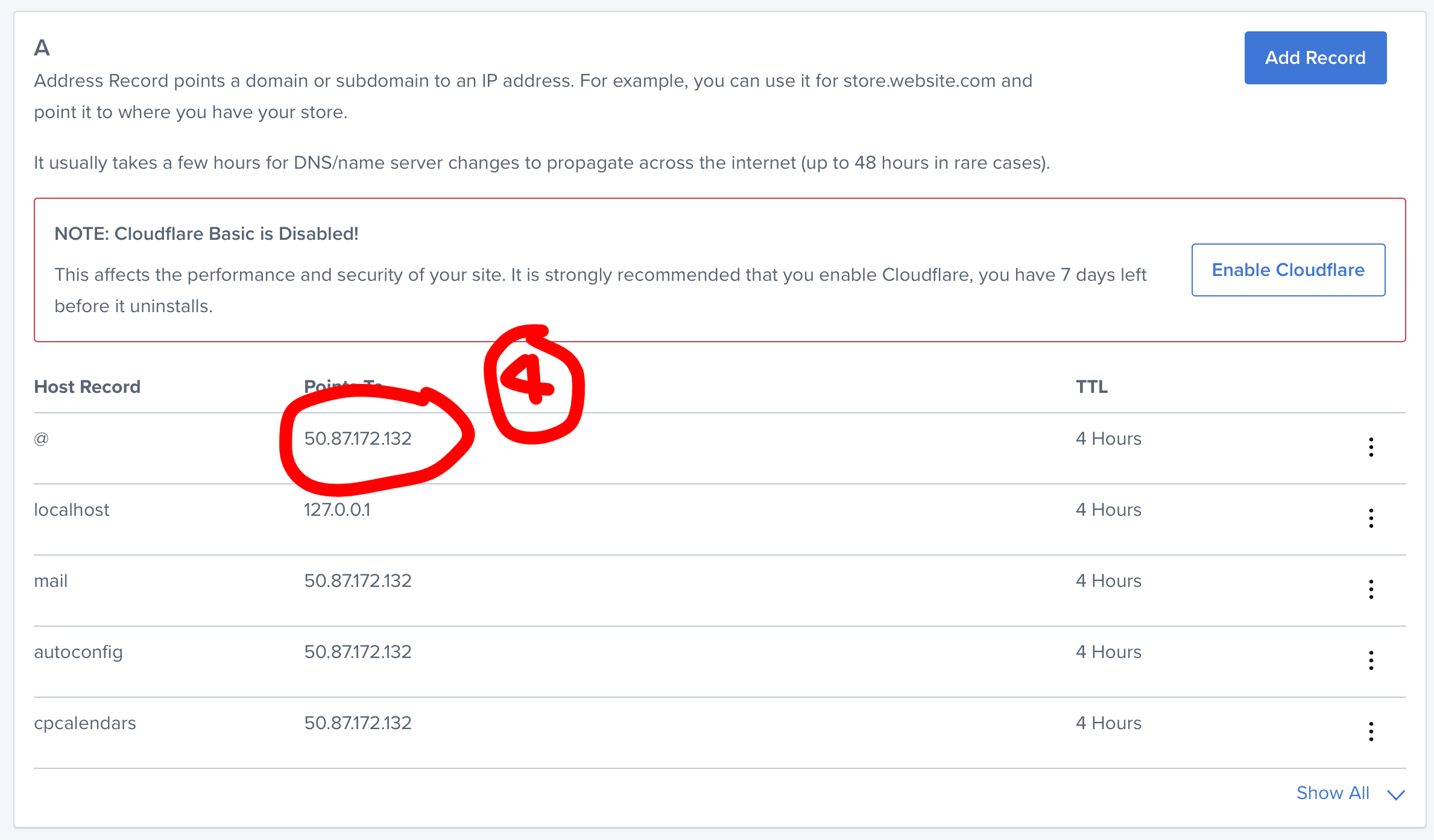 1. 내 도메인 페이지에 가서 DNS 페이지에 가서 A 레코드를 확인합니다.
